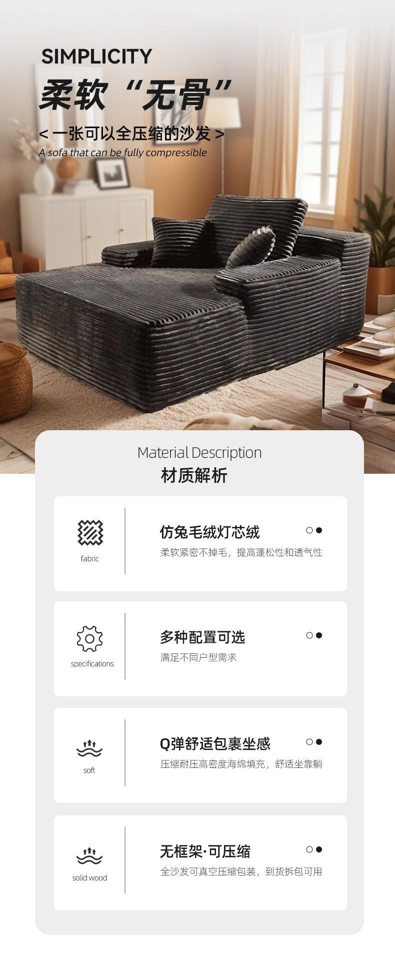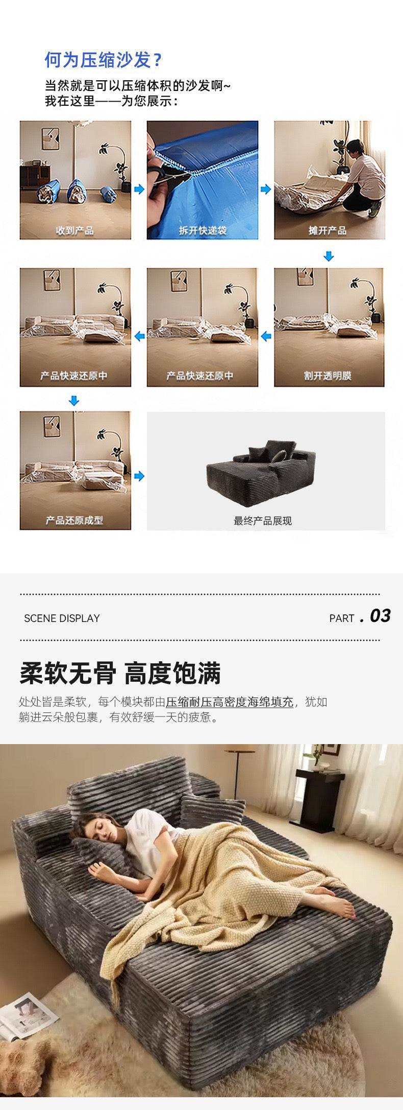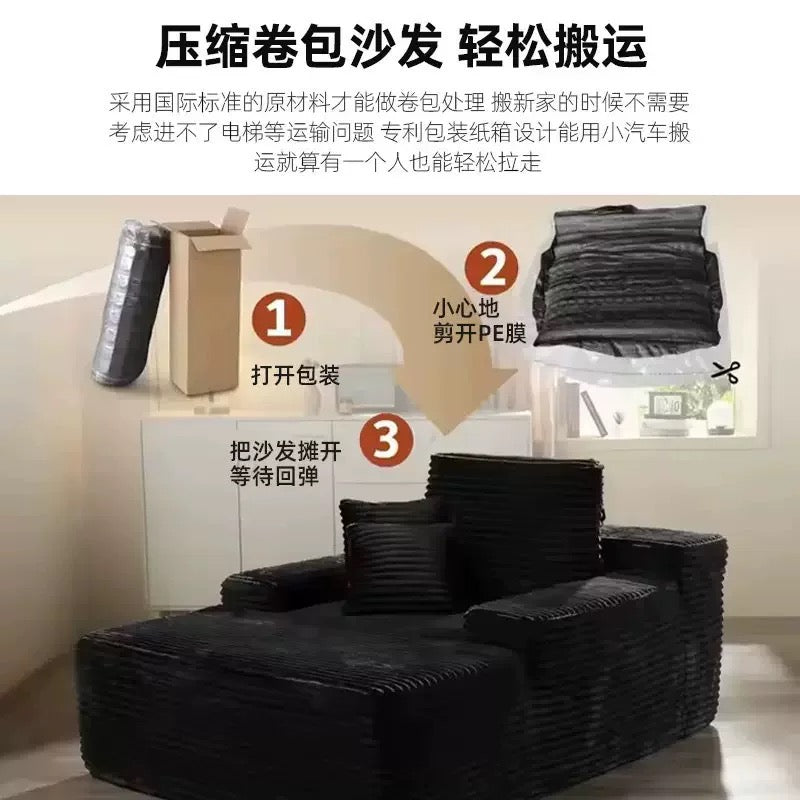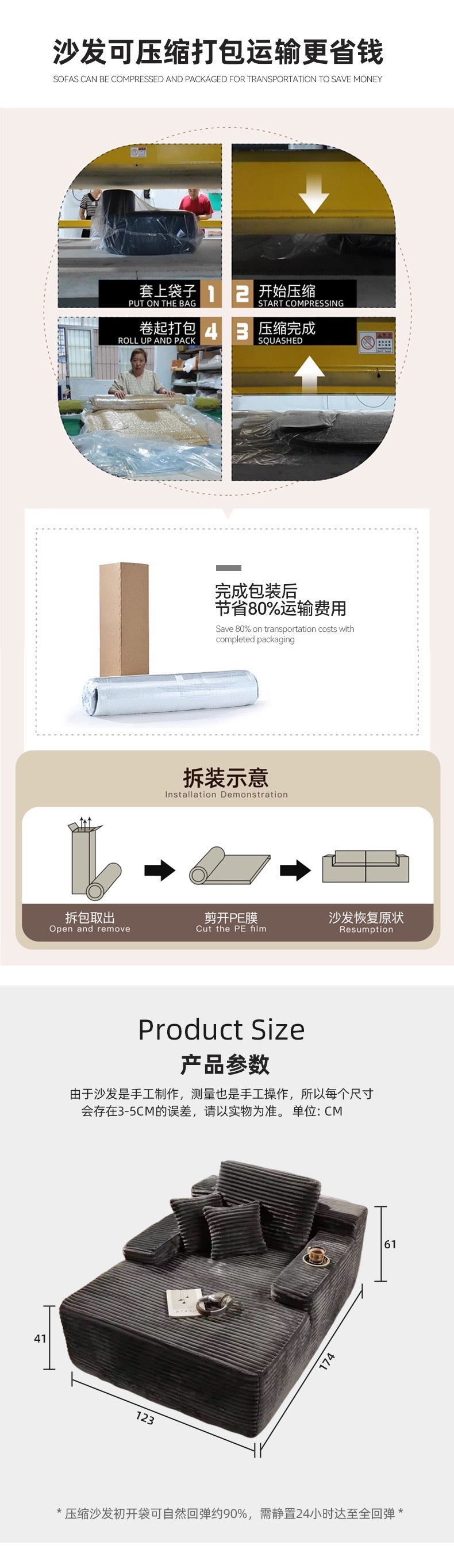 Equipped with advanced vacuum compression technology, this sofa is easy to transport and store. The vacuum-packed design significantly reduces its volume during shipping, lowering transportation costs and reducing environmental impact. Once unpacked, the sofa quickly regains its original shape—no complicated assembly required—saving you time and effort.