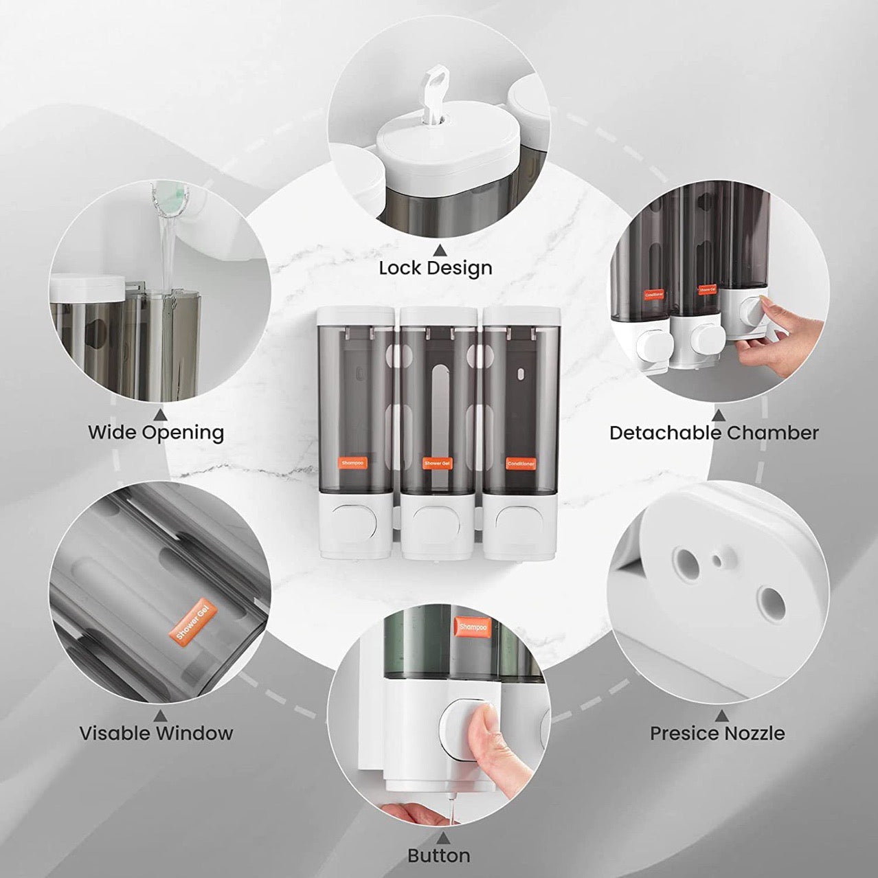 Featuring **three independent soap chambers**, each equipped with a smooth manual pump, it allows you to separate different liquids—such as hand soap, shower gel, and shampoo—meeting diverse daily needs. Its minimalist design with clean lines complements various styles, from modern and Scandinavian interiors to professional hotel spaces, making it both functional and aesthetically pleasing.